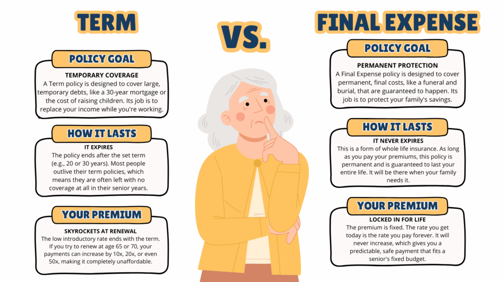 • Permanent is Better: A “Final Expense” (Whole Life) policy is permanent, and the rate is locked in for life. A “Term” policy expires and gets very expensive to renew.
