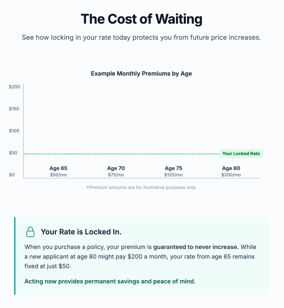 The younger you are when you lock in your policy, the lower your monthly premium will be for life.